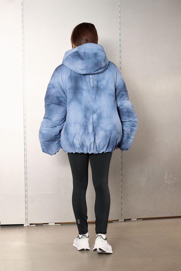 実際に羽織ってみると、シルエットが想像以上の可愛さ。女性がメンズを着たときの上半身のボリューム感に加え、特徴的な丸みのあるフォルムがメリハリを作って、全身バランスをよくしてくれる。このシルエットに加え、ブルーベースの「タイダイストーン柄」で、レギンスとのワンツーコーデもドラマチックに。いっぽうで、無地のような合わせやすさもあるのも嬉しい。シンプルなレギンスや細身のパンツ以外にも、太めのパンツやボリューム感のあるボトムスと合わせてもスタイリッシュにまとまる予感。