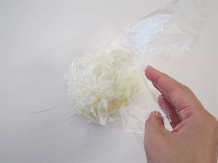 1. 玉ねぎをみじん切りにしたらラップに包み、電子レンジで1分加熱する。