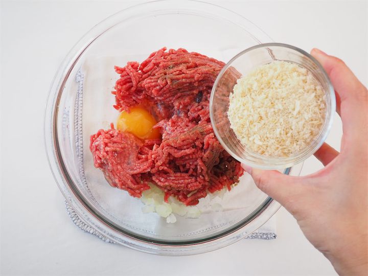 2. ボウルに1、合い挽き肉、卵、塩、こしょう、パン粉を加えてこねる。