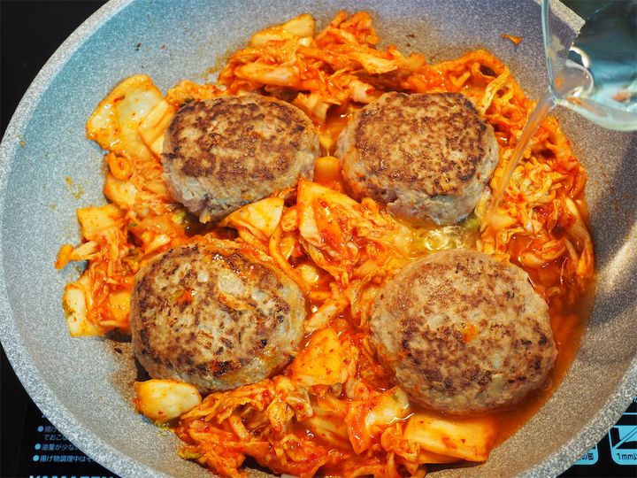 肉の旨味が出ていそうなので、ハンバーグのまわりの油はキープしてみました。煮込む際も強火でいいのか不明だったので、中火弱で調理。この時点では汁気が多すぎないか心配になりましたが、いい感じに水気が減りとろみがつくので安心して煮込んでいきましょう!水やキムチは表面を覆うほどではなかったため、時折ひっくり返しながら煮込みました。
