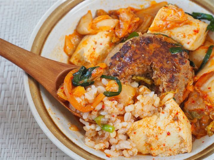 初めて見るルックスにワクワクした気持ちに。ゴマ油の風味とキムチの香りに食欲をそそられます。ハンバーグを崩すと、じゅわ〜っと肉汁が溢れ出してきます。その旨味とキムチの旨辛が合わさって、「お、おいしい!」。わたしの中では、だしとなるものやコチュジャンなどを入れてこそスンドゥブの旨味が決まると思い込んでいたので、ガラッと常識が覆りました!肉汁、しょうゆ、ゴマ油でしっかりとコクのあるスープになっています。