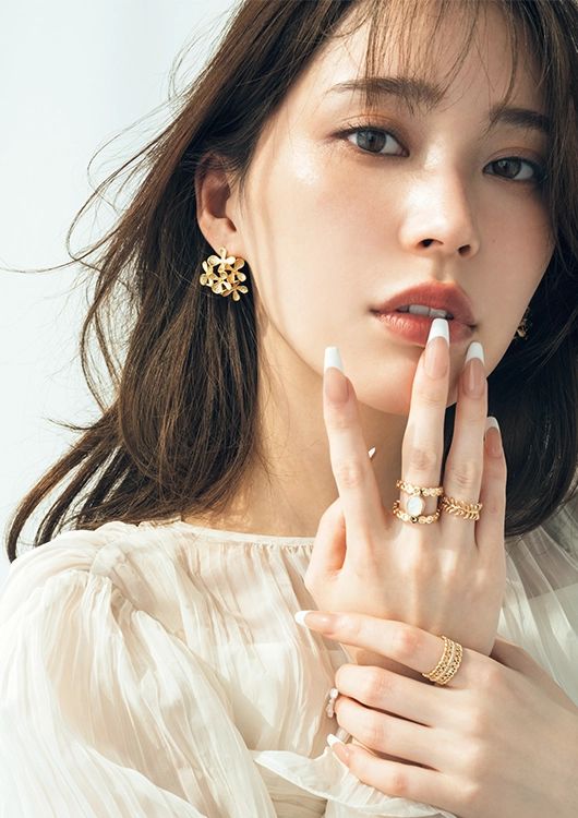 花モチーフピアス[SS]¥14,300、【右手中指】リング[真鍮×MOP]¥19,030、【薬指】リング[真鍮]¥15,400、【左手人さし指】リング[真鍮]¥16,830/以上by 164 PARIS(ルゥルゥ商會) シアーブラウス¥17,600/CELFORD ルミネ新宿2店