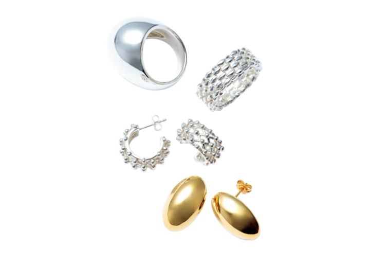 【上から】ボリュームリング[SV925]¥23,100、メッシュリング[SV925]¥15,950、メッシュピアス[SV925]¥14,300、ピアス[K10YG]¥18,700/以上ココシュニック オンキッチュ(ココシュニック)