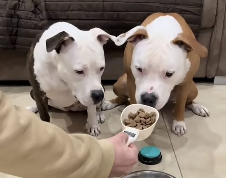 ご飯の量を測っている飼い主さん。