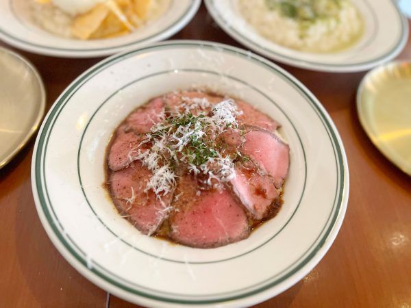 まずは、「ローストビーフのリゾット」を。まず、リゾットのお米が程よい硬さで、味が染みていてすごく美味しい!上にたっぷりのったローストビーフもとても柔らかく、くるっとリゾットを巻いて楽しみました。