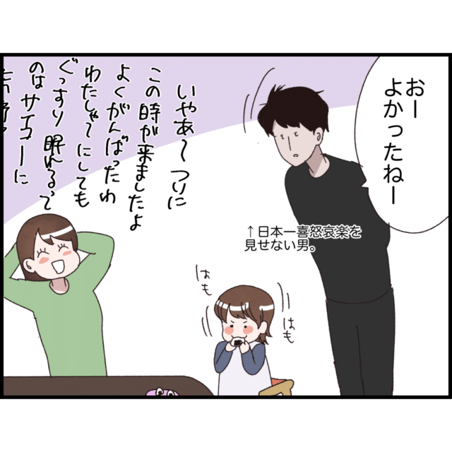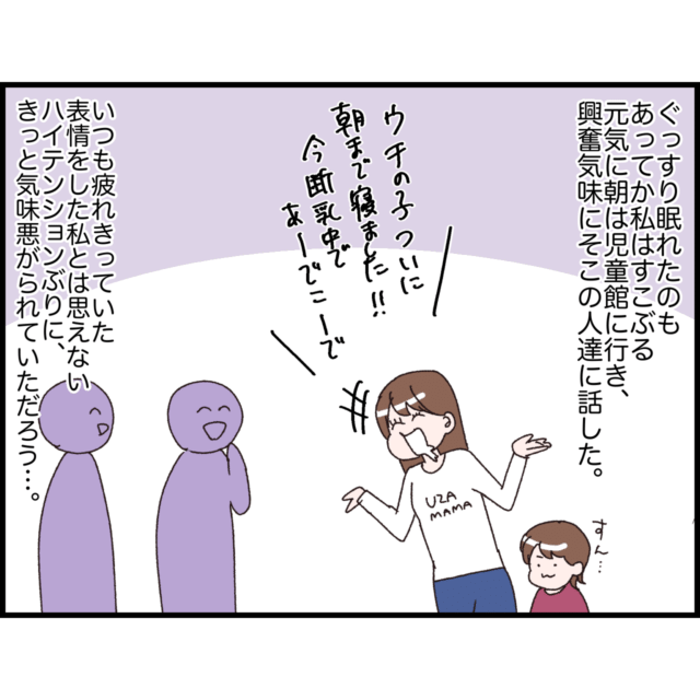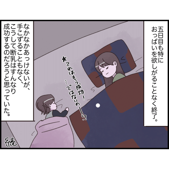 卒乳が理想だったものの、最終的には断乳を決意したしおさん。断乳5日目の朝、娘ちゃんの泣き声で目を覚ましたしおさんがスマホで時間を確認すると朝の7時12分。信じられずしばらくフリーズしたしおさんは、むくりと起き上がると静かにガッツポーズ!約1年4ヶ月ぶりに一度も起きることなく朝までぐっすり寝ることができたのでした。