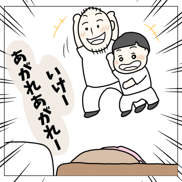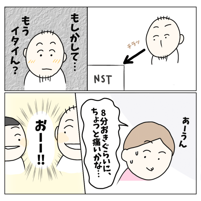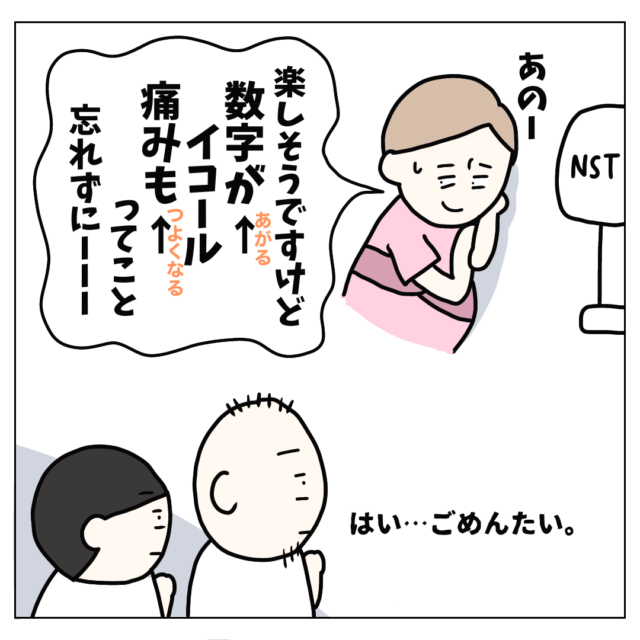 3. 痛みに耐える私の横でNSTの数字を見ながら「いけーあがれー」とお祭り騒ぎの夫と息子。6歳長男立ち合いの第2子出産レポ[4]|ぬーこの育児漫画