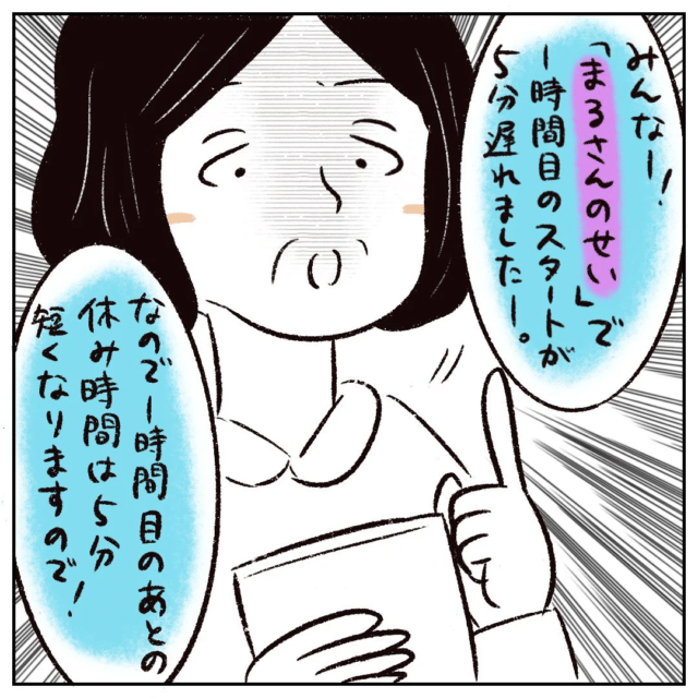 その時、先生が教室へ入って来て「みんなー!『まるさんのせい』で1時間目のスタートが5分遅れましたー。なので1時間目のあとの休み時間は5分短くなりますので!」と大きな声でみんなに言いました。