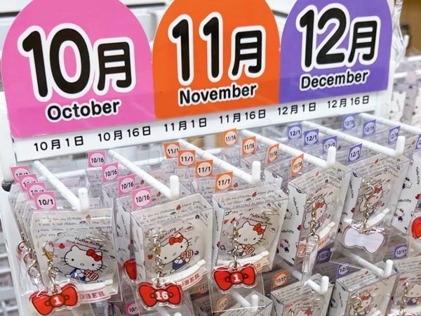 50周年記念にふさわしい「あにばーさりーキーホルダー。(各990円)」は月毎に分かれ、揺れるリボンチャーム部分に日付があって全366日分販売されています。自分の誕生日や記念日はもちろん、贈る相手の誕生日を選ぶのも良いですね。
