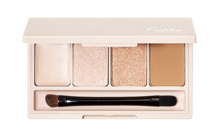 左から2番目のクリアハイライトをまぶた全体に、右から2番目のベージュハイライトをアイホールと下まぶたに、右のローライトをまぶたのキワにのせて完成。フジコ 足しパレ 04 彫り深ヌード 光と影 ¥2,178(かならぼ)