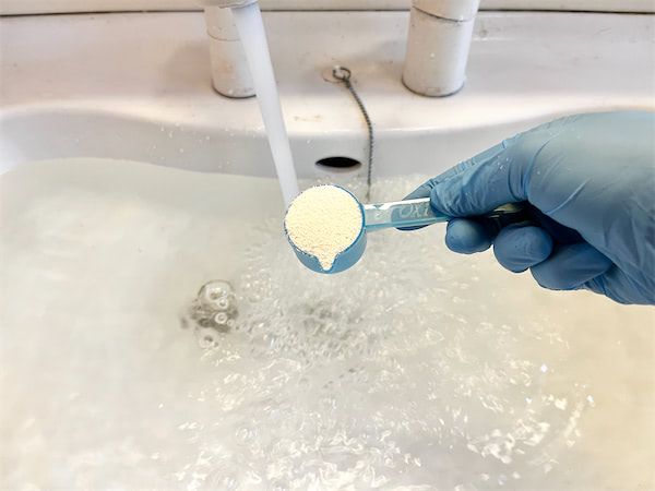 排水口内部に沿うように、濃度の高いオキシペーストをゆっくり注いで、1時間放置します。