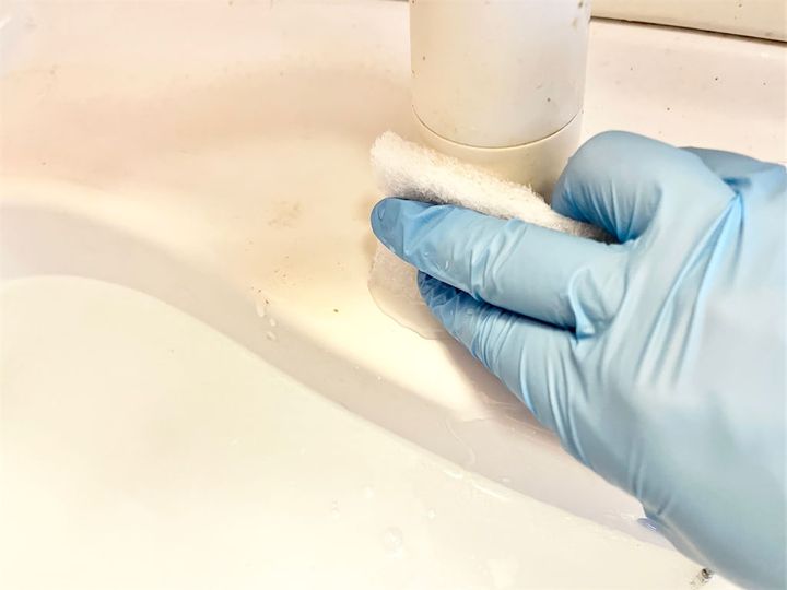 待っている間に、オキシ溶液を含ませたスポンジで水栓金具をこすり洗いしていきます。力を入れなくてもスルスルと汚れが落ちて、おもしろいくらいです♪