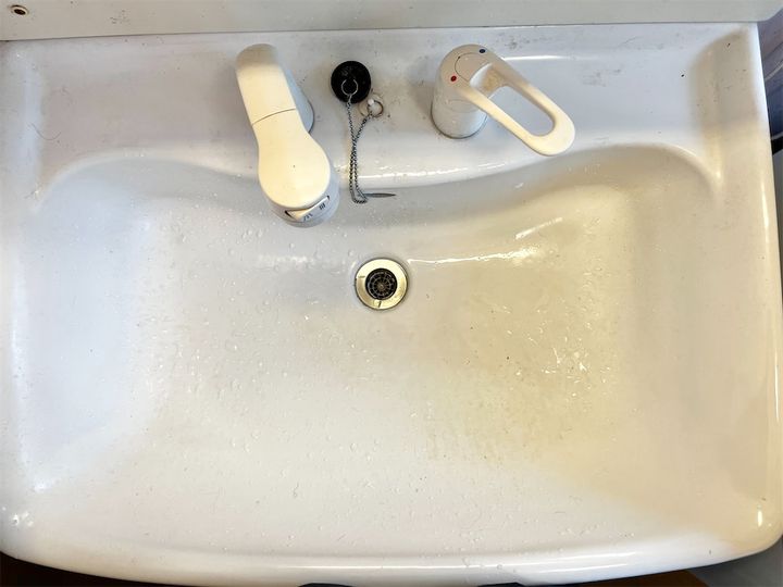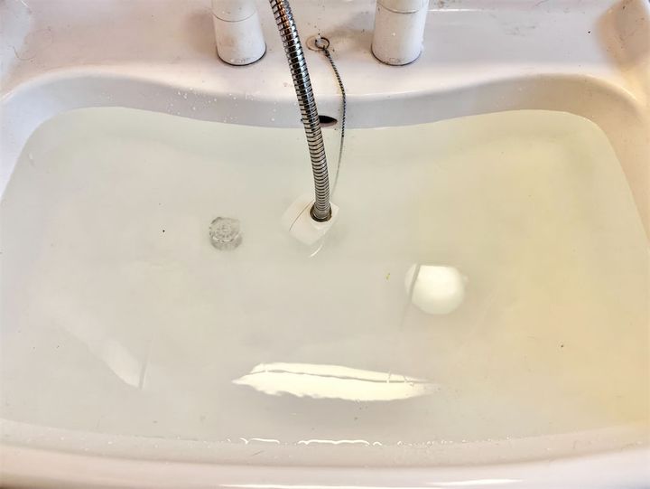 洗面台のオキシ漬けが終わった後、全体を水で流してオキシクリーンを落とします。