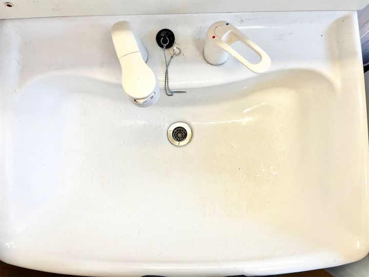 洗面台の底部分も、水アカや飛び散った石鹸などで汚れていました。それが…