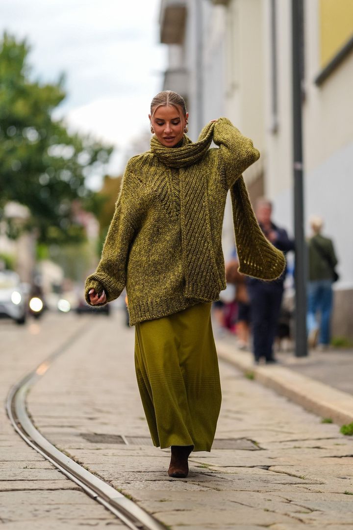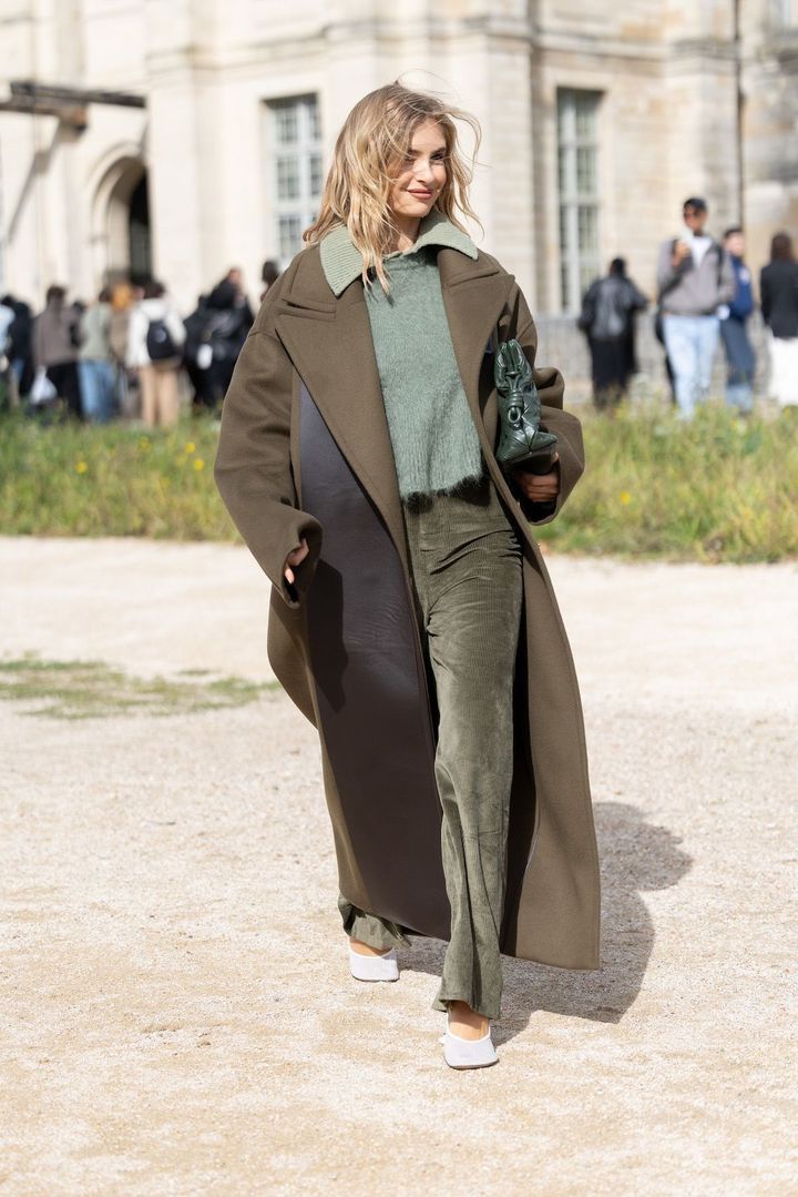 今シーズンらしいカラーといえば、やはりトレンドのカーキ一択。2024-25年秋冬に着こなすなら、ミリタリーやワークウェアといったカジュアルな定番スタイルではなく、エレガンスを意識したい。上のスナップは、全身同系色ながら、それぞれ異なるトーンを選びグラデーションを活かしたコーディネート。一方、下の2つのスナップのように、トップとボトムのカラーを統一するのも◎。