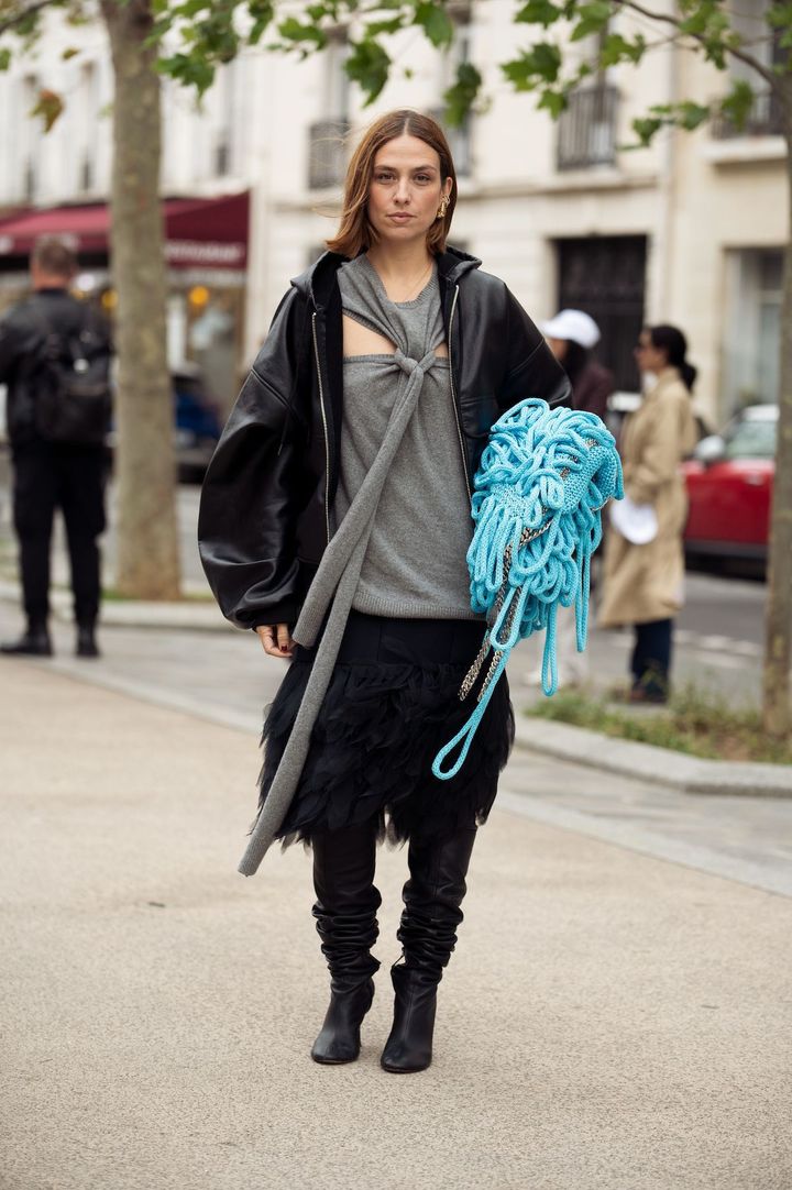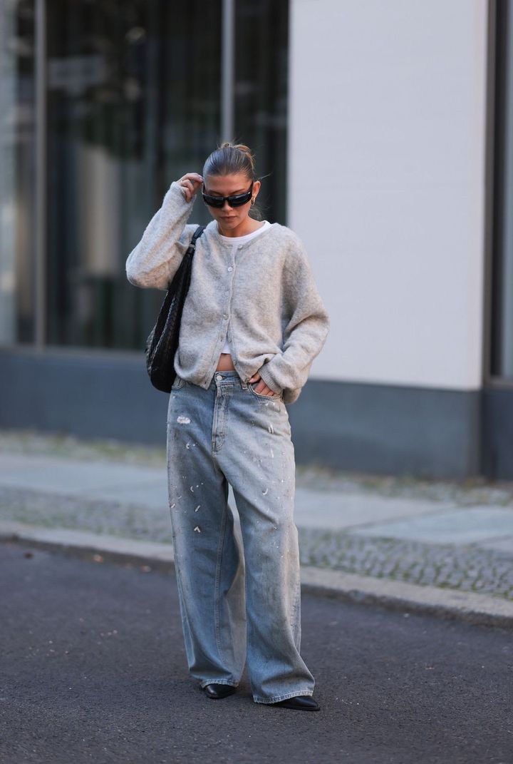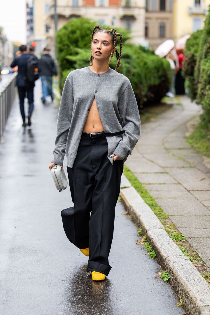 グレーのニットカーディガンを着用したスタイルを、各都市のコレクションのオフランウェイで多数キャッチした。下のボタンを開けて肌を見せて抜け感を狙えば、大定番のアイテムながら新鮮な仕上がりに。アクネ ストゥディオズACNE STUDIOS)のデニムのようなバギーシルエットのパンツを選んで緩やかなAラインを作り、ストリートなムードを醸すのがポイントだ。人気アーティストのロザリアも大胆な肌見せを実践中の模様。