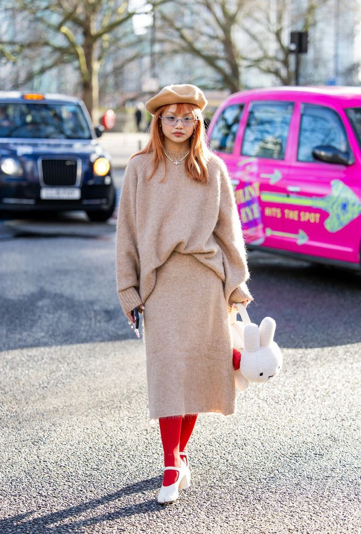 クラシックでスタイル問わないベージュのニットは、トライしやすいアイテム。スナップのようなニットスカートとのセットアップは、スウェットかのように気軽で動きやすいにも関わらず、カジュアル過ぎないのが魅力だ。モード感溢れるサングラスやギークなテイストのシルバーフレームのアイウェア、そしてヴィヴィッドなタイツなど強めのアクセントを効かせ、“脱ほっこり”を狙って。