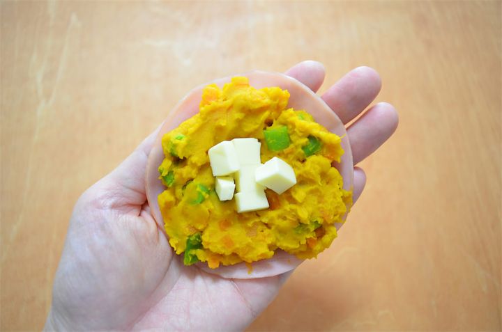 かぼちゃは揚げてもはみ出しにくいので、ハムで完全に包まなくてもOK。