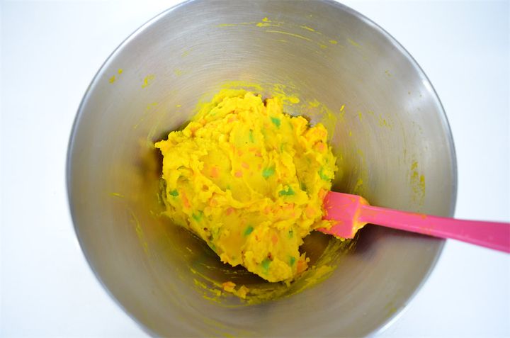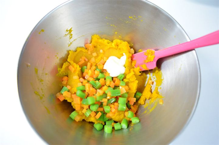 3. 1のかぼちゃをつぶし、2の野菜とマヨネーズを加えて混ぜる。