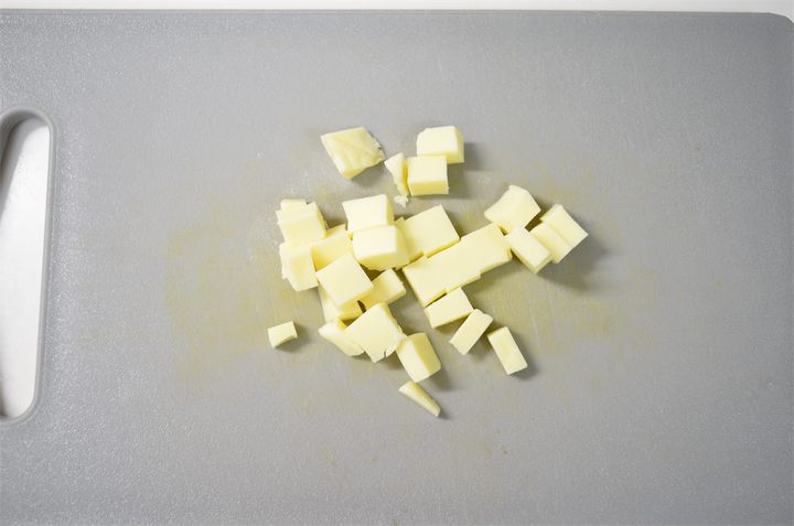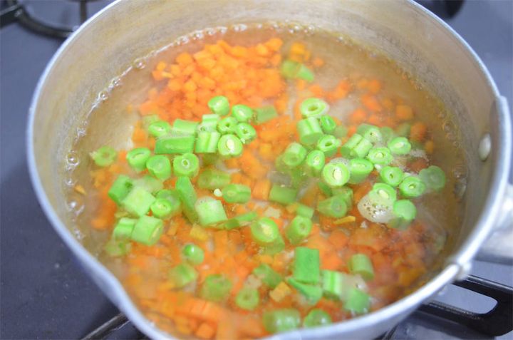 2. いんげんは小口切り、にんじんは粗みじん切りにして、塩を適量入れた湯(分量外)でさっと茹でたらザルにあげる。プロセスチーズは5mm角に切っておく。