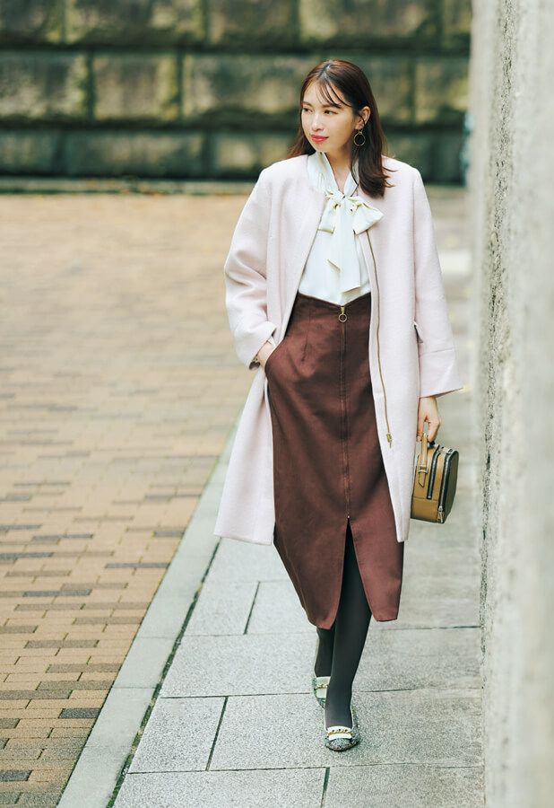 コートを着回し ブラウス¥6,930/MISCH MASCH スカート¥19,800/ジャスグリッティー イヤリング¥6,820/イットアトリエ(14 SHOWROOM) バッグ¥52,800/エポイ(エポイ本店) タイツ¥1,100/満足(福助) シューズ¥17,600/ダイアナ(ダイアナ 銀座本店)