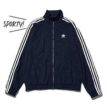 ライン入りジャケット/アディダス オリジナルス(アディダスお客様窓口) 「スポーティアイテムが豊作の中、本格的なスポーツブランドも黒なら都会的。前を全部閉めてトップス風にすれば、いつものデニムとローファーに合わせても違和感なし」(スタイリスト・船戸さん)