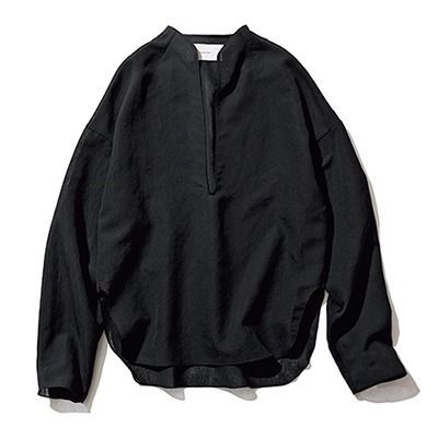 黒スタンドシャツ/アストラット(アストラット 新宿店) 自然と抜けが生まれる、横幅が広いスタンドネック。ハリと微光沢でドレスシャツのような気品が。