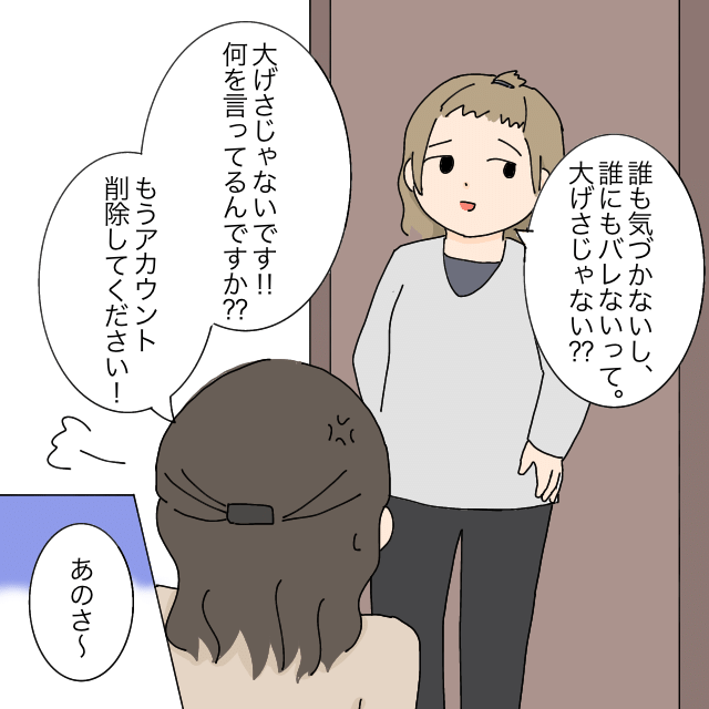 スミレちゃんママは小馬鹿にしたように笑って「誰も気づかないし、誰にもバレないって。大げさじゃない?」といいました。ハナちゃんママは「大げさじゃないです!何を言ってるんですか!?もうアカウント削除してください!」と怒りをぶつけました。