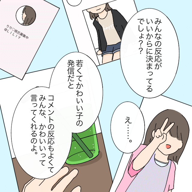 「若くてかわいい子の発信だとコメントの反応もよくてみんな、かわいいって言ってくれるのよ。」