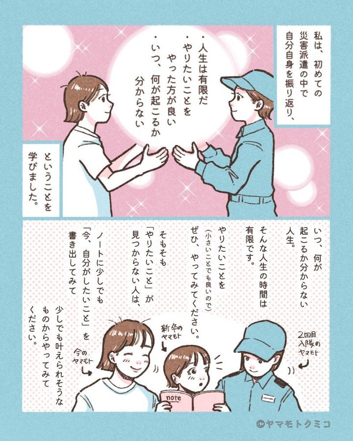 元海上自衛隊のイラストレーター・ヤマモトクミコさんが、東日本大震災の支援を通じて学んだことをマンガでお伝えする連載「元自衛隊員が描く“こころの防災”」。