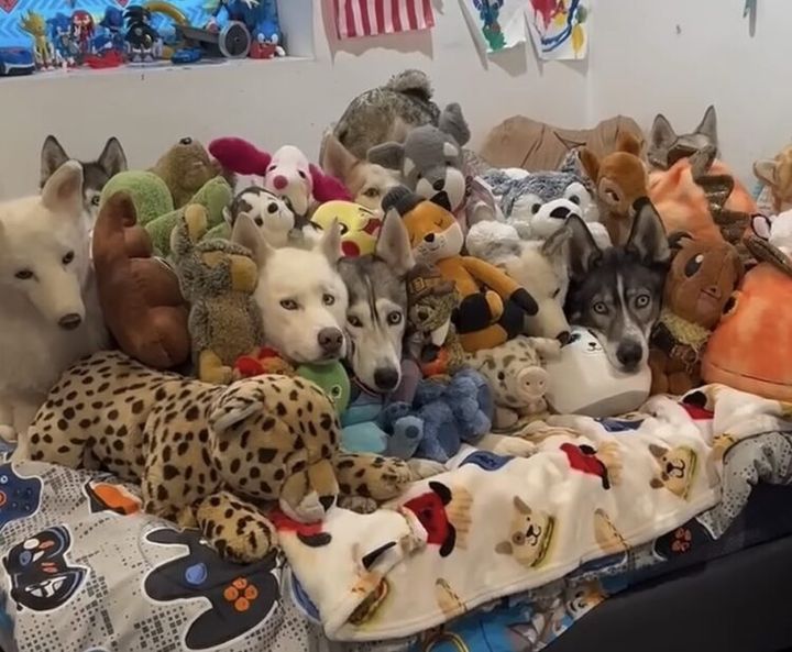 一体何匹いるでしょうか! ぬいぐるみの中にいる犬さん、見つけられる?