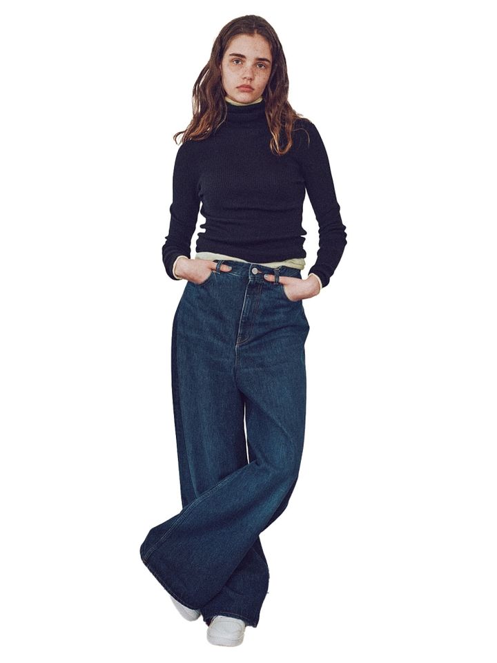 バギーデニムパンツ/ターン ストゥディオ(ユナイテッドアローズ 渋谷スクランブルスクエア店) 腰を落として穿いても脚が短く見えない、股上深めのバギーデニム。シューズを覆うほどに太いパンツの余白が、脚線を細くイメージづけ。ぶかっとしたシルエットはトップスとの自然なメリハリを生み、上半身を華奢に見せてくれる。濃度の高い色みで重心を下げ、はっきりとしたAラインを強調。