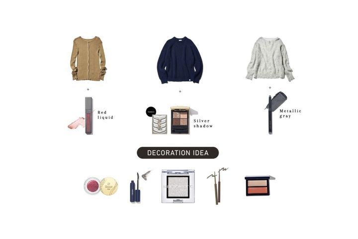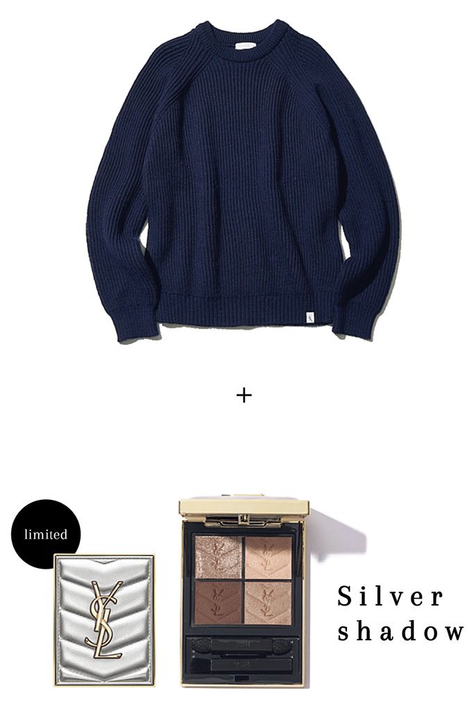 「キラキラ光るラメシャドウ」は、ニットをリッチに引き上げ、“手の込んだ”仕上がりをかなえるために欠かせない。よく着るニットの風合いとシルエットによって、組み合わせたいコスメをご案内。
