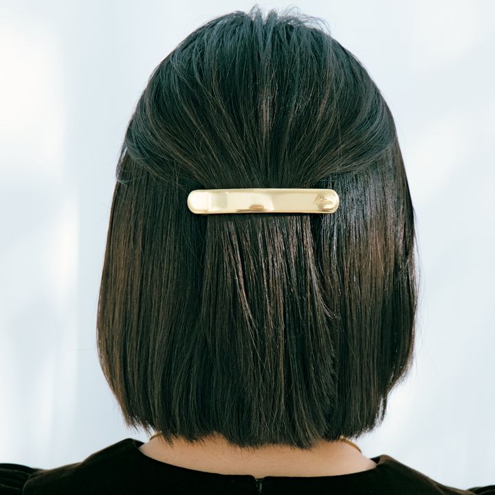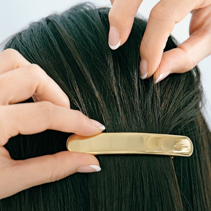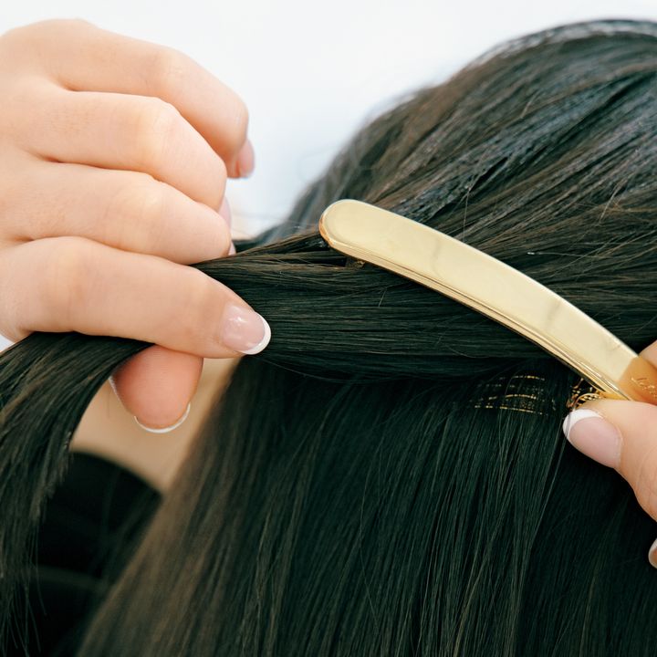 3.分けとった毛束と地肌の髪をすくってまとめてバレッタで留めます。地肌の髪をしっかり入れ込むと、バレッタがずれにくく安定感がアップ。