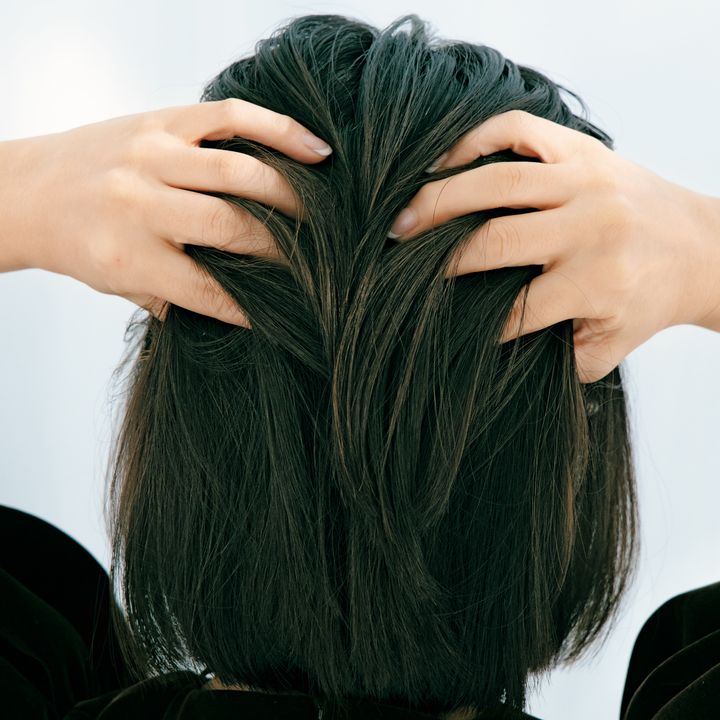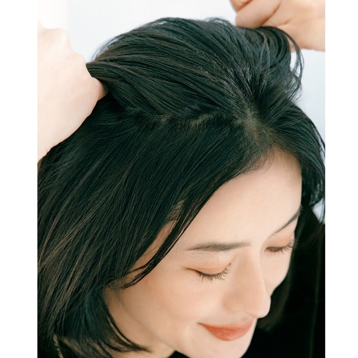 2.両手の小指でハチから上の髪を分けとります。小指をジグザグに動かしながら分けとることで地肌の線が出ずにふんわり仕上がります。
