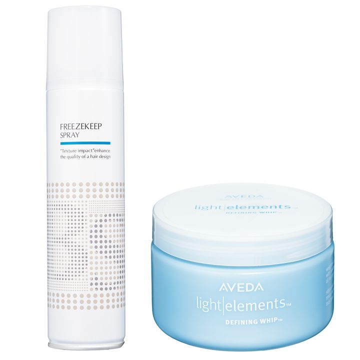 軽い質感でヘアに動きをプラスしてくれるスタイリング剤。左 スタイリング力が強いのに固まらないスプレー。BSスタイリング フリーズキープ スプレー280ml ¥1,650(アリミノ)右 ライトエレメンツ ディファイニング ホイップ125ml ¥4,400(アヴェダ)