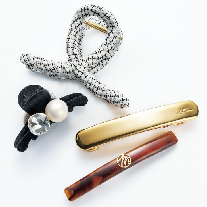 上からクリップ¥880(アネモネ/サンポークリエイト)ミニクリップ¥2,860(DECOLLTE ACCESSORY)バレッタ¥16,500(レチシア) ※モデル着用分 バレッタ¥2,640(muku/アンティローザ)