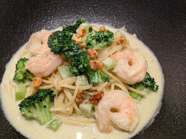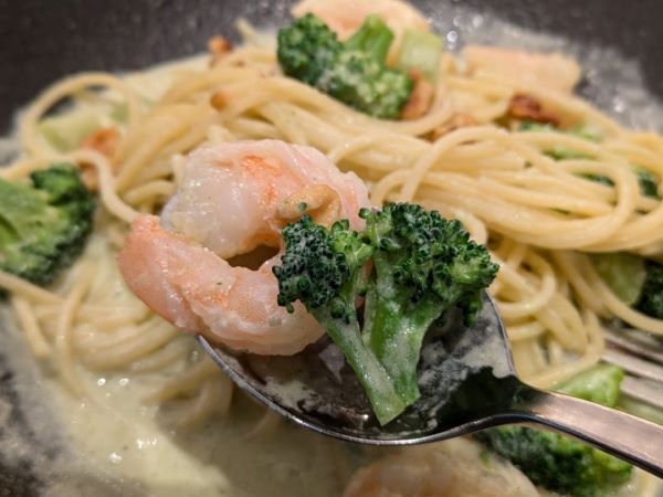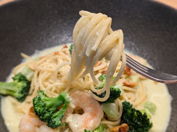 期間中は、限定メニュー「博多ブロッコリーと海老のアンチョビクリーム レギュラー:1,408円 スモール : 990円」「箱崎小町と紅ずわい蟹のペペロンチーノ レギュラー:1,408円スモール : 990円」の2種類登場。また、既存メニュー「ねぎとひき肉 1,408円」にも箱崎小町が使用されるとのことです。(全て税込価格) できたての「博多ブロッコリーと海老のアンチョビクリーム」が運ばれてきました。海老とアンチョビの香りに食欲がそそられます。
