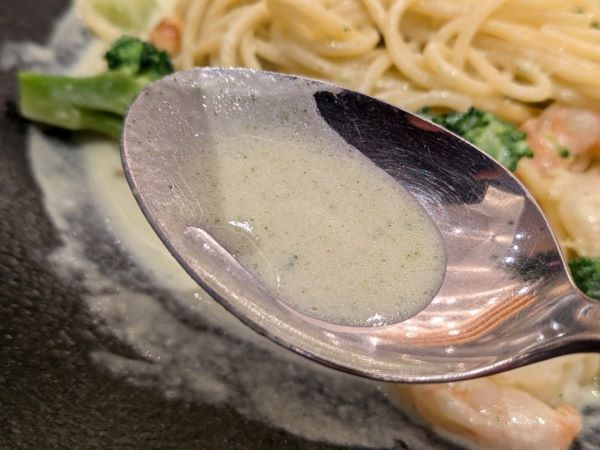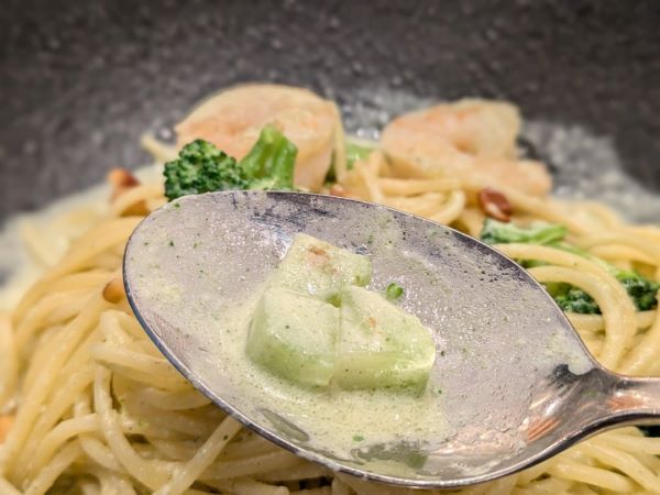 まずは、博多ブロッコリーの房だけなく茎もミキサーにかけてペースト状にし、ブロッコリーをあますことなく使ったクリームソースをいただいてみます。ツブツブが見えるくらいたっぷりブロッコリーが使われていますね。コクのあるクリームに野菜のおいしさが加わって深い味わいです。