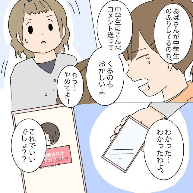 「おばさんが中学生のふりしてるのも、中学生にこんなコメント送ってくるのもおかしいよ。もうやめてよ!!」純粋な中学生のことばに、さすがのスミレちゃんママも「わかったわよ、これでいいでしょ。」SNSアカウントをようやく削除しました。