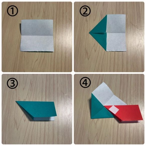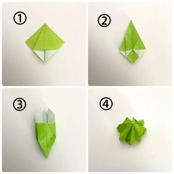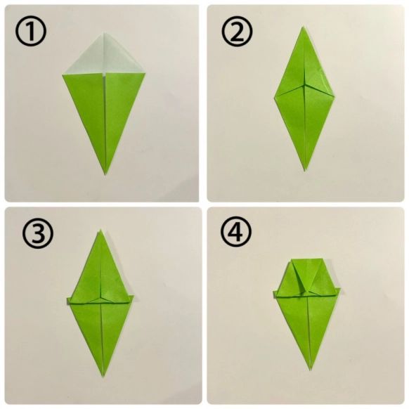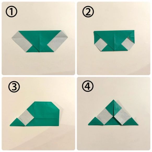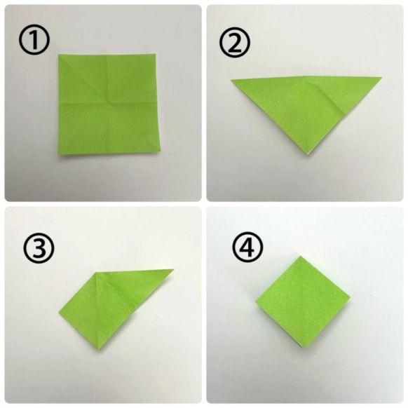 1.緑色の折り紙から折っていきましょう。まずは対角線に折り線がつくように、三角に折って開いてを2回行います。下の角を中心に合わせて折ったら、上の角を上のフチに合わせて折りましょう。写真の1のような形になります。