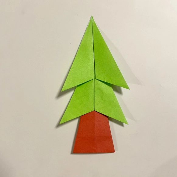 10.下の角(見えているのが裏面の部分)を内側に折り込めば、幹の部分の完成です。最初に折った枝葉2つと幹を差し込んで組み合わせれば、簡単なクリスマスツリーができあがり☆