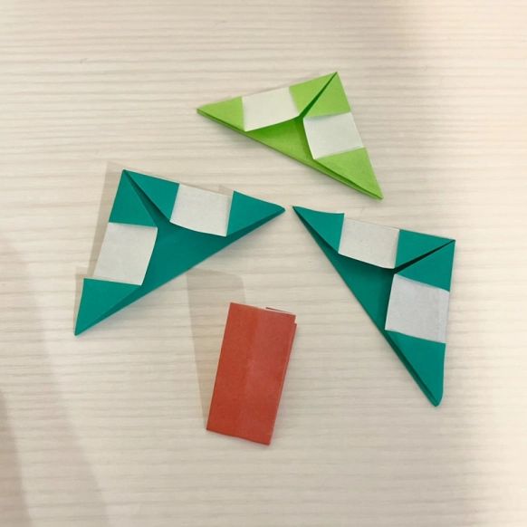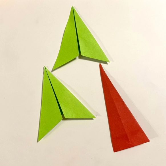 1.まずは緑色の折り紙を1枚ずつ折っていきます。三角折りを1回して開き、もう一度別の角と角を合わせて三角折りをしましょう。