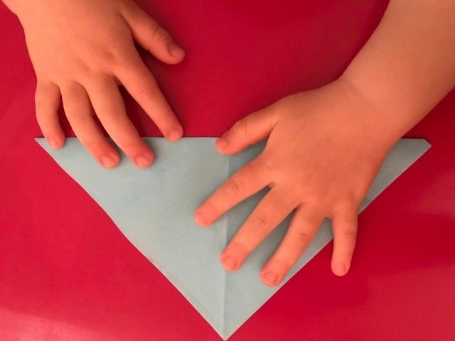 6.緑の折り紙と同様に、最初は折り紙の角と角を合わせて三角に折り、折り線をつけて開きましょう。