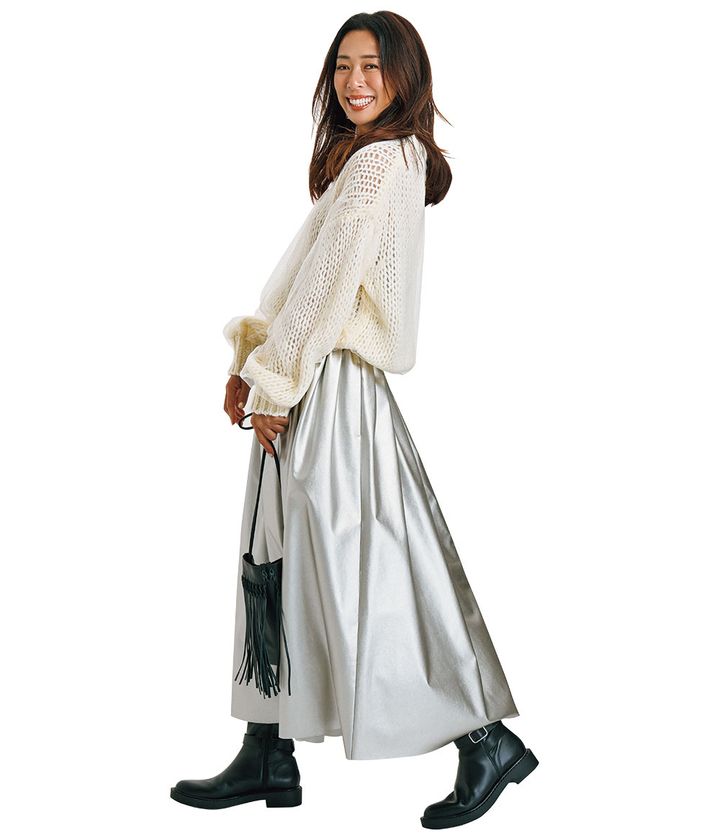 同色のチュールを重ねたトレンド感たっぷりのニットには、シルバーが目を引くボリュームスカートがマッチ。ブーツとバッグを黒レザーで引き締めてモードな抜け感もプラスして。