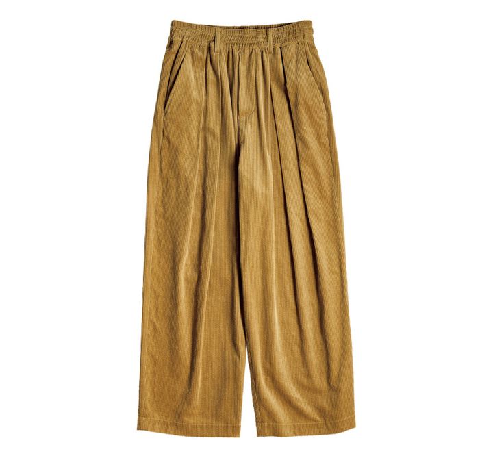 光沢のあるコーデュロイ生地にクラシックなムードが漂う〈ニコルソン アンド ニコルソン〉のパンツ。タックが2本入っていて、裾に向かってゆるやかにカーブを描くシルエットは美しく、きちんと感も兼ね備えているので、コーディネートに取り入れやすい。ウエストはゴム仕様で、中はドローストリングになっているので、自分好みのサイズ感に調節できる。