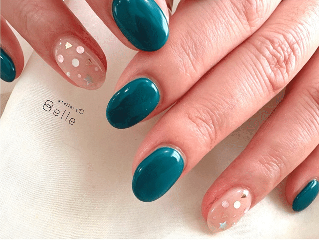 少し透けたベージュの透明感とホロドットの輝きと、グリーンカラーがお互いを引き立て合う理想的なネイルデザインです!