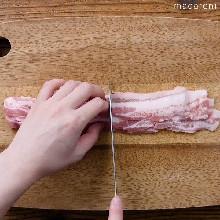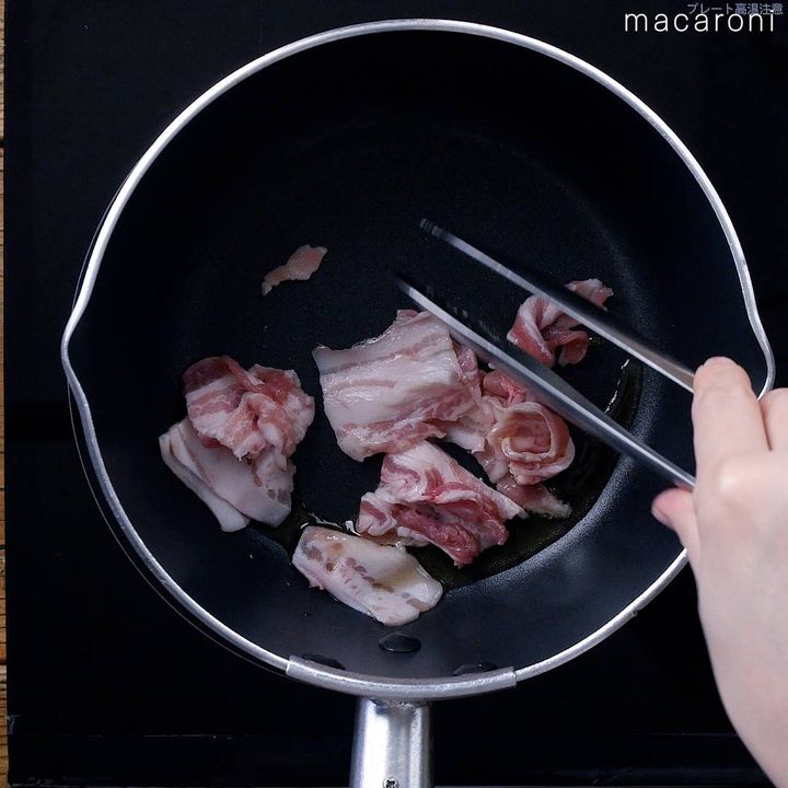 3: 鍋にごま油を入れて中火で熱し、豚バラ肉を炒めます。