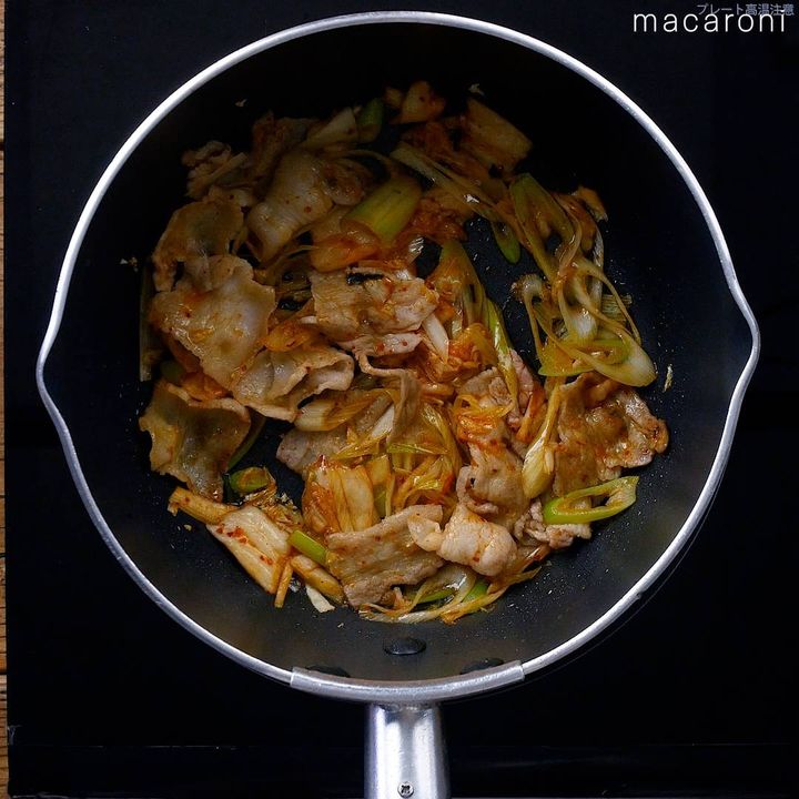 4: ある程度火が通ったら長ねぎとキムチを加え、香ばしい香りが立つまで2〜3分炒めます。