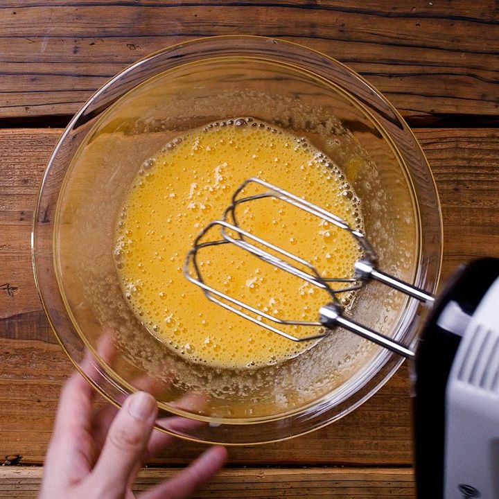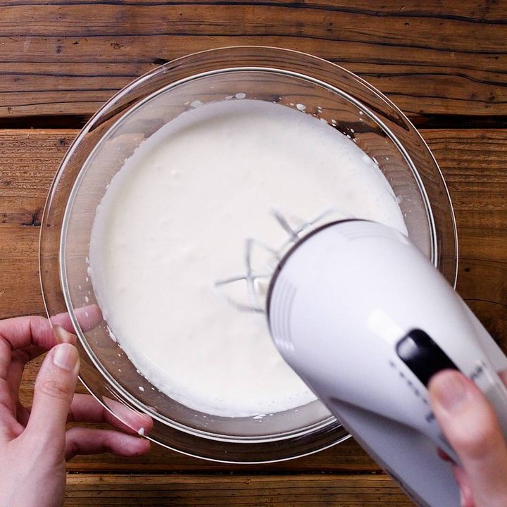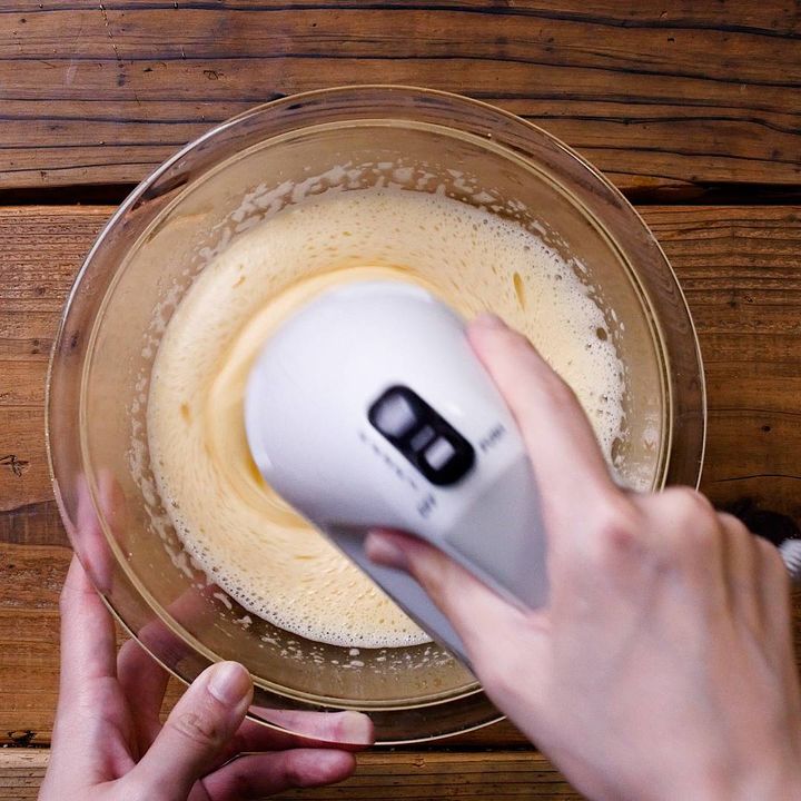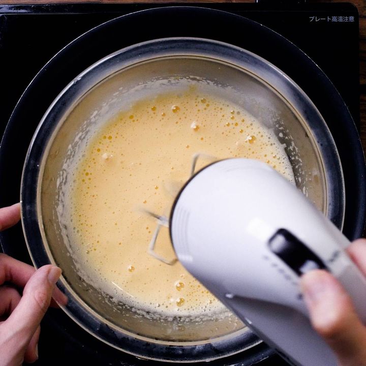 3: 湯煎から外し、ハンドミキサーの高速で泡立てます。